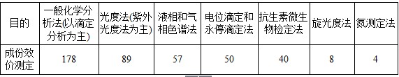 表11 各種分析方法和儀器在有效成份(效價)測定中被選用情況(種、次)
