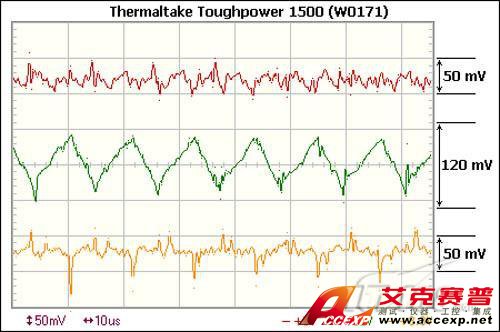 常見(jiàn)的紋波測(cè)試示意圖 在一些重點(diǎn)產(chǎn)品或者電源橫評(píng)的時(shí)候,會(huì)適當(dāng)加入紋波測(cè)試項(xiàng)目,如上圖所示,電源紋波測(cè)試成績(jī)圖一般都是波浪圖,因?yàn)檫@是記載紋波大小的峰值,即波形上沿到下沿的差值,當(dāng)然這個(gè)差值越小越好。