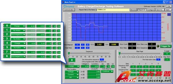 中茂 Chroma 電池測試及自動化解決方案提供電池充放電測試軟件,整合直流電源及電子負載來進行電池模塊測試,此系統可方便研發/品保測試電池的: a.容量測試(Capacity Test) b.放電性能測試(Discharge performance),在不同的放電率下得到C-V曲線 c.循環壽命測試 (Endurance in Cycles)。電池充放電測試軟件功能包括編輯測試順序,循環和停止條件,所測電壓 /電流 /電量將被記錄在一個文件中以便之后進行分析。