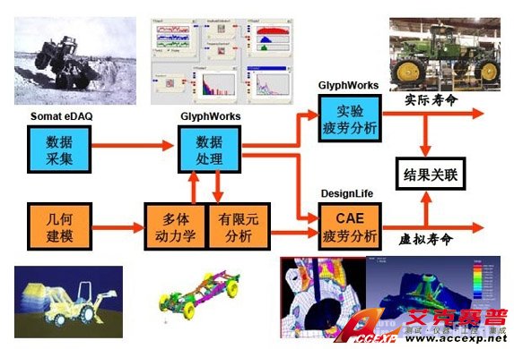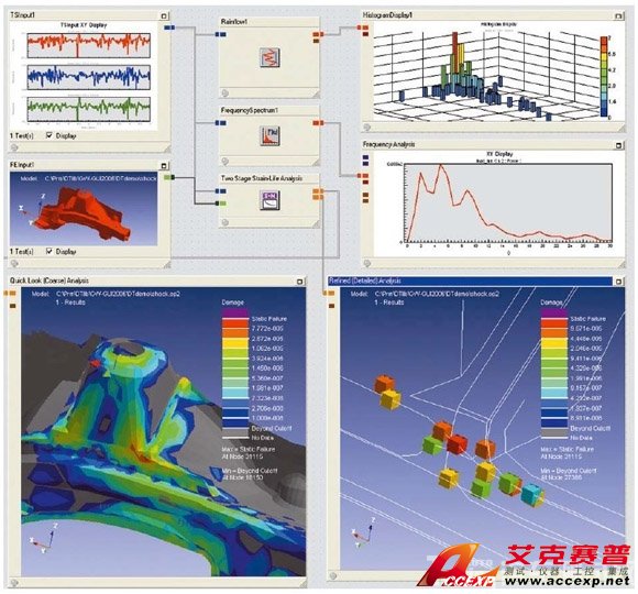 數(shù)據(jù)采集器所記錄的原始數(shù)據(jù)通常需要進(jìn)行分析處理才能變成工程中有用的信息。 原始數(shù)據(jù)的常規(guī)處理通常包括:信號(hào)的顯示、編輯、算術(shù)及三角運(yùn)算;頻譜分析;數(shù)據(jù)格式轉(zhuǎn)換;單位轉(zhuǎn)換、元數(shù)據(jù)處理及報(bào)告等。對(duì)于疲勞耐久性而言,需要鑒別出原始數(shù)據(jù)中所包含的異常信號(hào)并修正這些信號(hào),通過不同的方法對(duì)數(shù)據(jù)的有效性進(jìn)行檢驗(yàn)。需要將時(shí)域數(shù)據(jù)進(jìn)行付里葉變換,獲得信號(hào)中的頻率內(nèi)容,或者進(jìn)行雨流計(jì)數(shù)得出數(shù)據(jù)中包含的循環(huán)頻次信息。在零部件臺(tái)架試驗(yàn)部門, 需要將采集的數(shù)據(jù)根據(jù)疲勞等效原理轉(zhuǎn)換成一個(gè)加速試驗(yàn)所需的輸入數(shù)據(jù)。而在 CAE 分析部門,則需要從數(shù)據(jù)中提取出有限元分析、多體動(dòng)力學(xué)分析和疲勞壽命分析所需要的時(shí)間域有效載荷譜。另外,從實(shí)測量中直接預(yù)測疲勞壽命也是耐久性分析中的一項(xiàng)內(nèi)容。ICE-flow GlyphWorks 就是英國 nCode 公司為了滿足上述工程需要而開發(fā)的新一代數(shù)據(jù)處理和疲勞分析工程軟件。