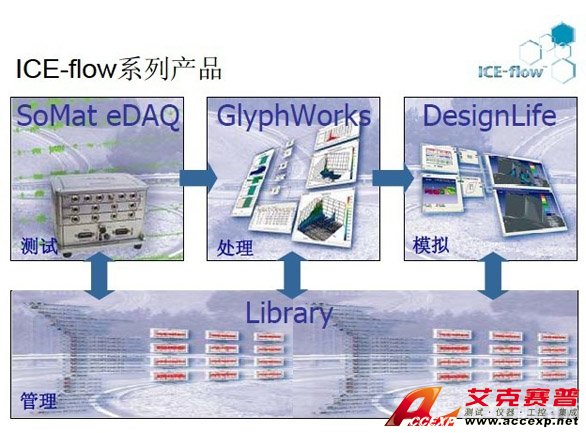 作為著名的疲勞耐久性技術(shù)服務(wù)公司之一的英國恩科(nCode)國際有限公司開發(fā)了一整套用于汽車耐久性設(shè)計(jì)、分析、試驗(yàn)及管理的硬件和軟件工具——ICE-flow系列產(chǎn)品。包括:數(shù)據(jù)采集器 Somat eDAQ、數(shù)據(jù)分析處理及實(shí)驗(yàn)疲勞軟件 GlyphWorks、CAE 疲勞分析軟件 DesignLife 和耐久性數(shù)據(jù)管理軟件系統(tǒng) Library。ICE-flow 集工程數(shù)據(jù)采集分析處理、疲勞壽命分析模擬、實(shí)驗(yàn)室臺(tái)架加速和遠(yuǎn)程數(shù)據(jù)傳遞及管理于一身,是進(jìn)行一體化抗疲勞設(shè)計(jì)必備的一個(gè)分析工具, 也是進(jìn)行異地協(xié)同設(shè)計(jì)的有效工具。 ICE-flow系列產(chǎn)品如圖 2所示,以下對(duì)各功能分別進(jìn)行介紹。