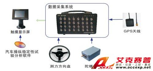本系統主機采用內置GPS的數采系統INDAS,用于車速測量,同時自帶4路模擬通道與RS232串口通道,可以兼容方向盤扭矩轉角傳 感器與陀螺儀, 用于測量轉向力矩、轉角、橫擺角速度、側向加速度、側傾角等參數。結合本系統自帶的軟件,除了可以將所有操穩試驗參數采集下來,同時還能完全按照GB/T6323.1~6的六個試驗標準進行試驗的后處理分析,迅速得出對汽車操縱穩定性能的評價。該系統既適用于各車輛檢測中心,也可用于整車廠的研發試驗。
