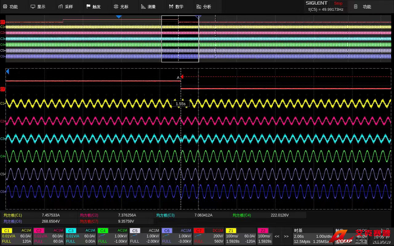 ● 三相交流電分析,三相交流電廣泛應(yīng)用于需要高能效或大功率的機(jī)電設(shè)備,如三相逆變器、電機(jī)、驅(qū)動(dòng)器等。逆變器廣泛應(yīng)用于家電、太陽(yáng)能光伏發(fā)電、風(fēng)能發(fā)電等,而在諸多汽車系統(tǒng)中,主驅(qū)、水泵、油箱冷卻系統(tǒng)都是由三相電所控制,對(duì)這些設(shè)備進(jìn)行功率分析和電能質(zhì)量測(cè)量必不可少。使用SDS6000 Pro分析三相電時(shí),其中3路接高壓差分探頭測(cè)量電壓,3路接電流探頭測(cè)量電流,這樣不僅能直接觀測(cè)到實(shí)時(shí)波形,還能利用數(shù)學(xué)運(yùn)算進(jìn)行各種信號(hào)處理得到電流有效值、視在功率、波峰因數(shù)、諧波失真等參數(shù)。
