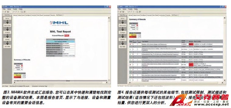 N6460A MHL 源端一致性測(cè)試軟件能夠生成全面的報(bào)告,其中不僅包括被測(cè)設(shè)備的性能和狀態(tài),還包括最重要測(cè)量的屏幕快照,以便于您進(jìn)行閱讀和分析。報(bào)告的首頁(yè)會(huì)列出標(biāo)準(zhǔn)規(guī)范測(cè)試認(rèn)證程序中要求的設(shè)備和配置細(xì)節(jié)。它還提供帶有超文本鏈接的結(jié)果表格,使您可以快速找到感興趣的測(cè)量報(bào)告部分。圖 4. 報(bào)告還提供每項(xiàng)測(cè)試的其他細(xì)節(jié) , 包括測(cè)試限制、測(cè)試描述和測(cè)試結(jié)果 ( 適當(dāng)情況下還包括波形 )。此外 , 報(bào)告給出了測(cè)試結(jié)果的裕量 , 供您進(jìn)行更深入的分析。圖 3. N6460A 軟件生成匯總報(bào)告 , 您可以在其中快速和清楚地找到完整的設(shè)備測(cè)試結(jié)果。本圖是報(bào)告首頁(yè) , 顯示了與連接、設(shè)備和測(cè)量設(shè)備有關(guān)的重要會(huì)話信息。報(bào)告隨后以表格形式列出結(jié)果匯總。該表格為用戶提供了大量即時(shí)可見的信息。界面左側(cè)可以非常明顯地立即顯示設(shè)備測(cè)試狀態(tài) ( 合格或不合格 )。如果您將運(yùn)行多項(xiàng)測(cè)試,或測(cè)試要求有多種分辨率,您將接到警告,要求您留意給定測(cè)試的總體狀態(tài),包括測(cè)試的嘗試次數(shù)以及測(cè)試失敗的次數(shù)。測(cè)試名稱帶有超級(jí)鏈接,使您可以直接訪問希望查看的結(jié)果 ( 參見下面圖 5 中的眼圖結(jié)果 )。該數(shù)據(jù)還可通過訪問“結(jié)果 (Results)”選項(xiàng)卡獲得.