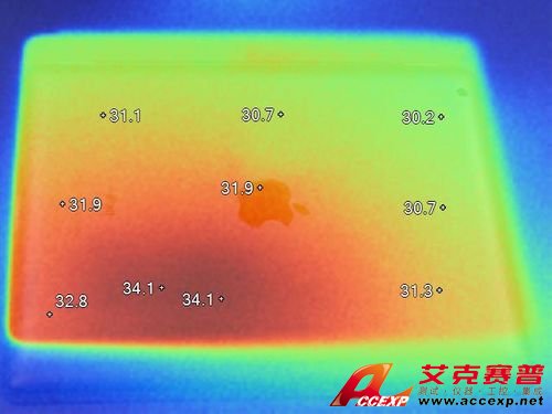 通過對比可以看到,新iPad的背部發(fā)熱的確要比iPad 2高。iPad 2最熱處為33.1°C,新iPad最熱處為34.1°C,其余對應(yīng)部位新iPad也比iPad高出1°C左右。
