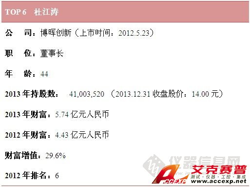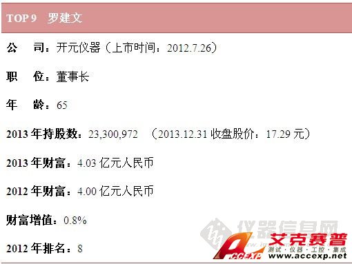 就財富值而言,雪迪龍敖小強憑借100%的增幅穩(wěn)居財富榜榜首,位居第2位的是聚光科技董事長王健,其2013年財富為18.52億元人民幣,排名第3的是天瑞儀器董事長劉召貴。