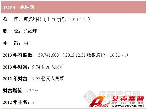 儀器儀表網(wǎng) http://www.bjdaisi.com.cn了解到,由儀器信息網(wǎng)發(fā)布的“國內(nèi)上市儀器公司創(chuàng)始人2013財富榜”中,入榜的10位公司創(chuàng)始人財富在2013年均實現(xiàn)了不同程度的增長,其中增長幅度最大的當屬雪迪龍董事長、總經(jīng)理敖小強,其2013年所擁有的財富高達40億元人民幣,增幅近100%。獲益于中國在環(huán)保監(jiān)測領(lǐng)域的大投入,雪迪龍在2013年業(yè)績突出,雖然雪迪龍在2013年“10轉(zhuǎn)10”增發(fā),但其股價依然與2012年底基本持平。敖小強個人財富的激增主要得益于此。