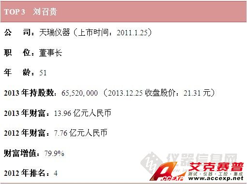 增幅排名第2的是天瑞儀器董事長劉召貴,其財富增長了約80%,2013年個人財富約14億元人民幣。2013年,天瑞儀器收購了環(huán)境監(jiān)測儀器企業(yè)宇星科技,之后股價呈現(xiàn)一路漲勢,借此劉召貴的財富實現(xiàn)大幅增長。