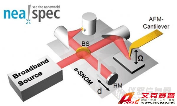 2013年,Neaspec公司推出了nano-FTIR光譜儀,利用其獨(dú)有的散射型近場光學(xué)技術(shù)發(fā)展出來的納米傅里葉變換紅外光譜技術(shù),使得納米級化學(xué)鑒定和成像成為可能。nano-FTIR光譜儀的工作原理如圖3所示,將一束寬帶中紅外激光耦合進(jìn)入近場顯微鏡(NeaSNOM),對原子力顯微鏡(AFM)針尖進(jìn)行照明, 通過一套包含分束器、參考鏡和探測器在內(nèi)的傅里葉變換光譜儀對反向散射光分析,即可獲得針尖下方20 nm區(qū)域內(nèi)的紅外光譜,使得紅外光譜成像系統(tǒng)的的空間分辨率突破了微米的界限。該類型儀器綜合了AFM的高空間分辨率,和FTIR的高化學(xué)敏感度,實(shí)現(xiàn)了對有機(jī)、無機(jī)材料的納米級化學(xué)分辨。