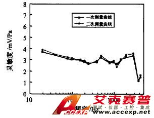 為檢測測量系統的重復性,實驗對1#傳感器進行了重復測量,圖3示出2次測量的靈敏度變化曲線。