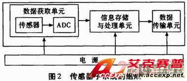 傳感器、感知對(duì)象和觀察者是傳感器網(wǎng)絡(luò)的三個(gè)基本要素。網(wǎng)絡(luò)中的傳感器節(jié)點(diǎn)(或稱為傳感器子系統(tǒng))由電源、數(shù)據(jù)獲取單元、信息存儲(chǔ)與處理單元和數(shù)據(jù)傳輸單元構(gòu)成,如圖2所示。電源為傳感器提供正常工作所必需的能源。數(shù)據(jù)獲取單元用于感知、獲取外界的信息,并將其轉(zhuǎn)換為數(shù)字信號(hào)。信息存儲(chǔ)與處理單元對(duì)數(shù)據(jù)獲取單元傳來(lái)的信息進(jìn)行必要的處理、保存,數(shù)據(jù)傳輸單元負(fù)責(zé)與其他傳感器或接收發(fā)送器之間的通信。觀察者是傳感器網(wǎng)絡(luò)的用戶,是感知信息的接受者或任務(wù)管理者,觀察者可以是人,也可以是計(jì)算機(jī)或其他設(shè)備。