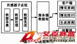 運(yùn)用傳感器網(wǎng)絡(luò)進(jìn)行環(huán)境監(jiān)測(cè)的系統(tǒng)結(jié)構(gòu)圖如圖3所示,系統(tǒng)硬件設(shè)備由傳感器子系統(tǒng)、服務(wù)器、客戶機(jī)和報(bào)警器組成。