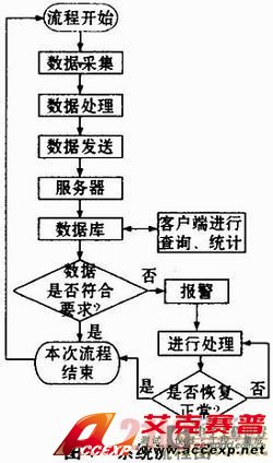 系統(tǒng)流程如圖4所示。針對(duì)不同的環(huán)境,根據(jù)需要采集的參數(shù)類型(溫濕度數(shù)據(jù)、煙感數(shù)據(jù)、煤氣感應(yīng)數(shù)據(jù)等)選擇相應(yīng)的傳感器,構(gòu)成相應(yīng)的傳感器子系統(tǒng),傳感器子系統(tǒng)將采集到的數(shù)據(jù)經(jīng)過(guò)處理后發(fā)送到服務(wù)器,服務(wù)器將接收到的數(shù)據(jù)自動(dòng)存入數(shù)據(jù)庫(kù),當(dāng)數(shù)據(jù)超出規(guī)定的范圍時(shí)啟動(dòng)報(bào)警器進(jìn)行報(bào)警,提醒值班人員及時(shí)進(jìn)行處理。值班人員也可以隨時(shí)通過(guò)客戶端軟件訪問(wèn)服務(wù)器,對(duì)環(huán)境參數(shù)進(jìn)行查詢、統(tǒng)計(jì)、生成報(bào)表,隨時(shí)掌握環(huán)境狀態(tài)。