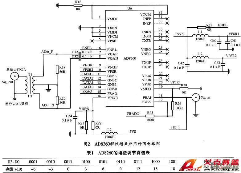 圖2所示是AD8260的外圍電路,其中AD8260芯片采用±5 V雙電源供電,也可以通過跳線實(shí)現(xiàn)+3.3V單電源供電。即將-5VS接地,R21焊接,R22斷路,+5VS接+3.3 V。