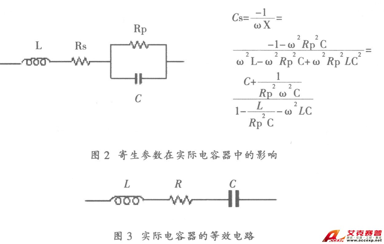 電容器的典型等效電路如圖1 所示, 在該電路中, 電容量C 是電容器的主要成分, Rs 和L 是引線和電極中存在的寄生參數, Rp 代表兩個電極間的寄生泄漏參數。