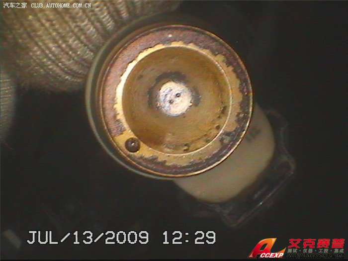 1#缸噴油嘴:可以清晰地看見中心的小孔,而且邊界清晰——干凈。邊緣的印漬的是汽油揮發后留下,不是積炭和積膠