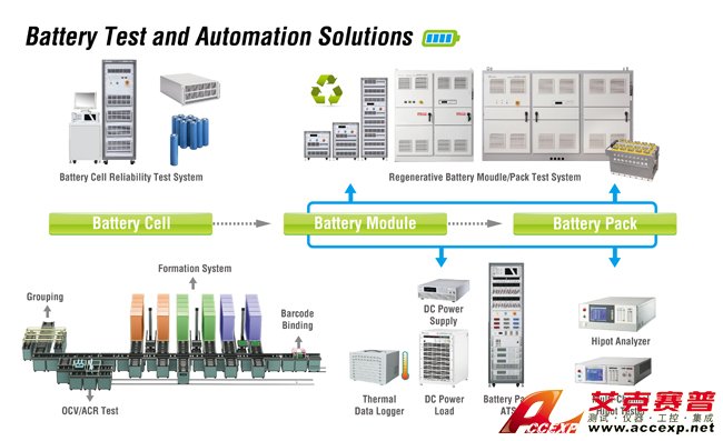 Accexp代理的Chroma 將在將電力電子產(chǎn)業(yè)耳熟能詳?shù)?000系統(tǒng)的成功經(jīng)驗(yàn)轉(zhuǎn)移到電池應(yīng)用領(lǐng)域,開發(fā)電池產(chǎn)業(yè)專用的測試項(xiàng)目(Test Item),可進(jìn)行電池管理系統(tǒng)(BMS)的自動(dòng)化測試。Chroma Model 8700系統(tǒng)具備靈活的硬體架構(gòu),針對電池業(yè)界產(chǎn)品高度客制化與多樣化的測試需求的現(xiàn)狀,可擴(kuò)充硬體與增加新測試項(xiàng)目,并支援多種硬體,例如直流電源供應(yīng)器、電子負(fù)載、LCR表、六位半數(shù)位電表等,透過不同硬體配置,可符合不同應(yīng)用的自動(dòng)測試需求。