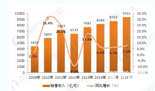 總體來看,近年來我國儀器儀表行業(yè)市場規(guī)模實現(xiàn)了快速擴張,銷售收入已由2009年的4420億元增至2016年的9355億元。2013年以來,我國儀器儀表行業(yè)產(chǎn)品銷售明顯回暖,增速趨于穩(wěn)定。2016年,我國儀器儀表行業(yè)銷售增速為7.5%。