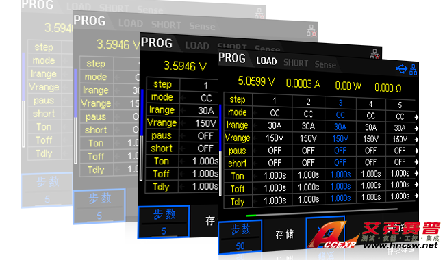 Program 功能可以模擬CC、CV、CR、CP、LED五種測試。通過對列表步數(shù)、存儲、觸發(fā)等參數(shù)進行設(shè)定,負(fù)載可以模擬總共可以編輯10個測試文件,每個測試文件最多支持 50 步。