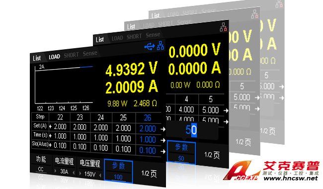 List 功能支持負(fù)載搭建多步的,定時的,不同帶載狀態(tài)的測試環(huán)境。通過編輯單步的步值、脈寬和斜率,負(fù)載可以生成多種復(fù)雜的序列組合,以滿足不同的測試需求。