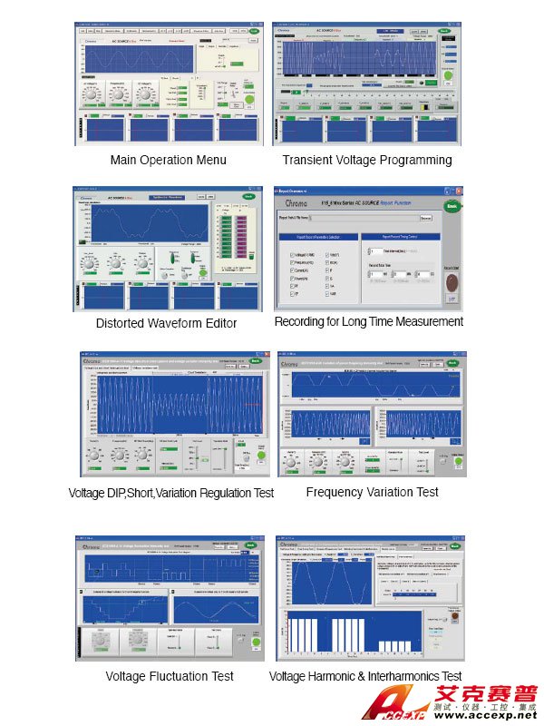 中茂 Chroma 61500 可編程交流電源提供圖形化接口的控制軟件, 提供簡易設定及操作, 可執行所有的功能. 并內建測試法規. 并可以長時間記錄量測值, 存成檔案供分析.
