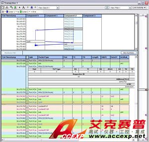 概要統計包括了各種有用信息,如平均傳輸等待時間、傳輸的總字節數以及總線利用情況。創新的單個事務窗口有助于查看數據包級和事務級的協議行為,中間穿插物理層活動。事務處理拼接功能表明數據包參與了一次完整的事務處理或由于圖解錯誤而導致事務處理不完整。其他能力 (包括光標鎖定多個數據窗口、通過鳥瞰法確定整個采集中看到的數據的相對位置、流程控制信用跟蹤和數據包的顏色編碼) 增強了系統級除錯功能。