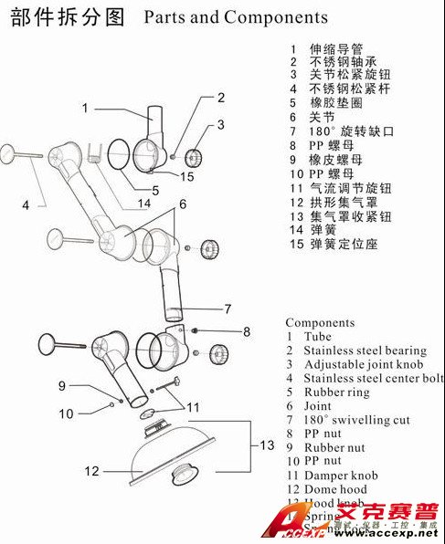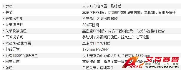 臺(tái)雄SAN-6103M三節(jié)萬(wàn)向抽氣罩采用高密度PP材質(zhì),可360°旋轉(zhuǎn)調(diào)節(jié)方向,易拆卸、重組及清洗,不易老化之高密度橡膠,使用304不銹鋼精制而成。