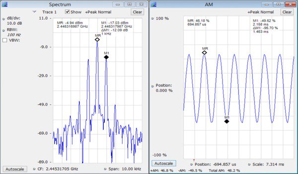 SignalVu-PC 標(biāo)配AM 和FM 信號分析功能。下面的屏幕圖顯示了把載波調(diào)制到48.9% 總AM 的1 kHz 音調(diào)幅度。頻譜畫面上使用標(biāo)記以1 kHz 偏置距載波12.28?dB 測量調(diào)制邊帶。調(diào)制畫面同時查看相同的信號,顯示了AM 隨時間變化及+Peak、-Peak 和總AM 測量。選項SVA 提供了模擬音頻調(diào)制高級測量,包括SINAD、THD 和調(diào)制速率。