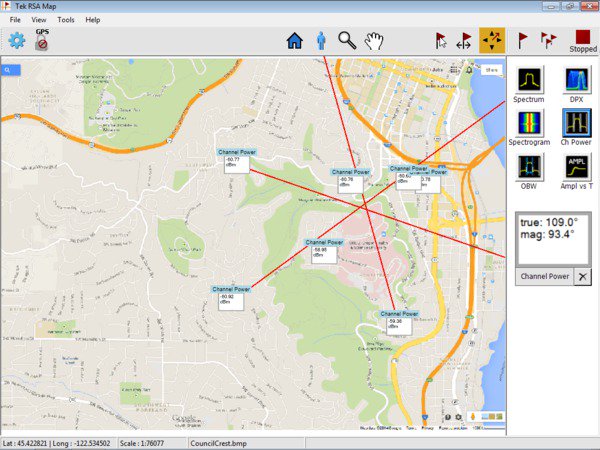 SignalVu-PC MAP應(yīng)用實現(xiàn)了干擾搜尋和位置分析功能。方位角功能可以在繪制的測量地圖上畫線或畫箭頭,指明進行測量時天線指向的方向,確定干擾位置。還可以創(chuàng)建和顯示測量標(biāo)簽。