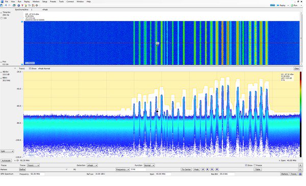 看到您以前從未看到的細節(jié):RSA306B 的 40?MHz 實時帶寬與 SignalVu-PC 的處理能力相結(jié)合,為您顯示每一個信號,在使用高性能電腦時可顯示最短持續(xù)時間為 27?μs 的信號。下圖顯示了WLAN 傳輸( 綠色和橙色),在屏幕中重復(fù)出現(xiàn)的窄信號是一只藍牙接入探頭。三維頻譜圖( 屏幕上方部分) 在時間上把這些信號清楚地分開,顯示任何信號碰撞。
