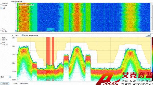 通過(guò)無(wú)人值守的模板監(jiān)測(cè)功能,可以簡(jiǎn)便地查找意想不到的信號(hào)。可以在DPX頻譜畫面上創(chuàng)建一個(gè)模板,在每次違規(guī)時(shí)采取相應(yīng)操作,包括停止采集、保存圖片、保存采集或發(fā)送聽(tīng)得到的告警聲。在下圖中,模板中紅色的地方發(fā)生了模板違規(guī),保存了得到的屏幕圖片。模板測(cè)試可以用于無(wú)人值守監(jiān)測(cè),在播放記錄的信號(hào)時(shí),可以在相同信號(hào)上測(cè)試不同的違規(guī)。