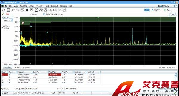 可以使用儀器和 SignalVu-PC,簡(jiǎn)便地完成 EMI 預(yù)一致性測(cè)試和診斷測(cè)量。可以在校正文件中輸入和存儲(chǔ)變送器、天線、前置放大器和電纜增益/損耗,可以使用SignalVu-PC的標(biāo)準(zhǔn)雜散測(cè)量功能,為測(cè)試確定極限行。下圖顯示了 30MHz ~ 960?MHz 測(cè)試,其中陰影部分是 FCC Part 15?Class A 極限。藍(lán)色譜線是捕獲的環(huán)境特點(diǎn)。違規(guī)記錄在圖下的結(jié)果表中。可以通過(guò)選項(xiàng) SVQP 增加 CISPR 準(zhǔn)峰值和平均值檢測(cè)器。