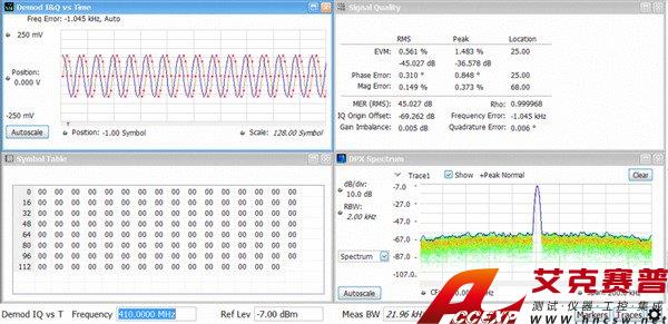 SignalVu-PC 應(yīng)用程序 SV21 在單個(gè)分析軟件包中捆綁了 27?種不同的調(diào)制類型,并可提供星座顯示、眼圖、符號(hào)表、網(wǎng)格圖、調(diào)制質(zhì)量概要等。符號(hào)速率和濾波器類型可以調(diào)整,另外還隨附可用于信號(hào)優(yōu)化的內(nèi)部均衡器。下圖為使用 18.0?k 符號(hào)/秒速度 pi/4DQPSK 調(diào)制所調(diào)制的 TETRA 標(biāo)準(zhǔn)信號(hào)。