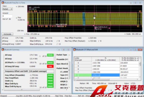 增加了兩個(gè)新選項(xiàng),幫助您在時(shí)域、頻域和調(diào)制域中進(jìn)行基于 Bluetooth SIG 標(biāo)準(zhǔn)的發(fā)射機(jī) RF 測(cè)量。選件 SV27 支持 RF 規(guī)定的基本速率和低能耗發(fā)射機(jī)測(cè)量。TS.4.2.0?和 RF-PHY。TS.4.2.0?測(cè)試規(guī)范。它還解調(diào)并提供增強(qiáng)數(shù)據(jù)速率數(shù)據(jù)包的符號(hào)信息。選件 SV31 支持藍(lán)牙 5?標(biāo)準(zhǔn)(LE 1M、LE 2M、已編碼 LE)和核心規(guī)范中規(guī)定的測(cè)量。這兩個(gè)選件也解碼所傳輸?shù)奈锢韺訑?shù)據(jù)并使用顏色編碼符號(hào)表中的數(shù)據(jù)包字段以便清晰標(biāo)識(shí)。