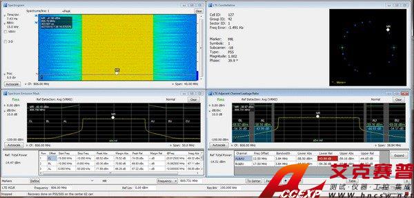 下圖顯示頻譜監(jiān)測(cè),其中結(jié)合使用三維頻譜圖畫面與小區(qū) ID/星座圖、頻譜輻射模板和 ACLR 測(cè)量。