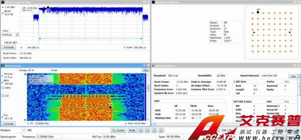 帶選件 SV23、24?和 25,可以方便地進(jìn)行完善的 WLAN 測(cè)量。在下面所示的 802.11ac (20?MHz) 信號(hào)中,三維頻譜圖顯示了初始導(dǎo)頻序列,后面是主信號(hào)突發(fā)。數(shù)據(jù)包的調(diào)制自動(dòng)檢測(cè)為64 QAM,顯示為星座圖。數(shù)據(jù)摘要顯示EVM 為-37.02?db RMS,突發(fā)功率測(cè)得 -17.32?dBm。SignalVu-PC 應(yīng)用程序適用于帶寬高達(dá) 40?MHz 的 802.11a/b/j/g/p、802.11n 和 802.11ac。