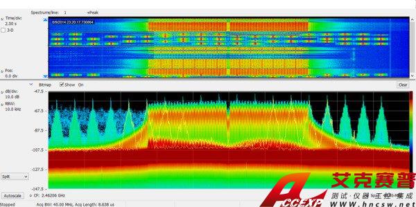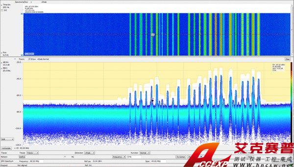 由于 40?MHz 實(shí)時(shí)帶寬,獨(dú)特的 DPX 頻譜/三維頻譜圖顯示干擾信號(hào)或未知信號(hào)發(fā)生的每個(gè)時(shí)點(diǎn),支持的最短持續(xù)時(shí)間可達(dá) 27?μs。下圖顯示了WLAN 傳輸( 綠色和橙色),在屏幕中重復(fù)出現(xiàn)的窄信號(hào)是一只藍(lán)牙接入探頭。三維頻譜圖( 屏幕上方部分) 在時(shí)間上把這些信號(hào)清楚地分開(kāi),顯示任何信號(hào)碰撞。