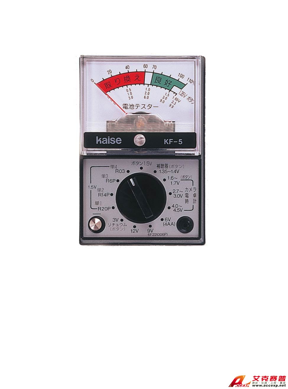 簡介:日本凱世KAISE KF-5指針式模擬萬用表詳細介紹 指針式模擬萬用表KF-5 日本凱世KAISE KF-5指針式模擬萬用表的參數(shù): 產(chǎn)品說明: 電池測試儀表 產(chǎn)品參數(shù): KF-5 電池種類 標準負荷 1.5V紐扣型 2mA 1.5V單4R...