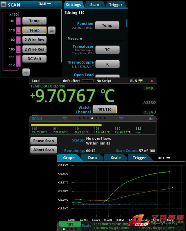 設置和運行測試簡單快速,無需編寫測試程序。 DAQ6510 數據采集和記錄萬用表系統的直觀觸摸屏能夠提供簡單的配置,以及可視的直觀測試設置、實時的掃描狀態可視信息,可盡早捕捉問題以避免丟失測試時間,便于分析測試數據。