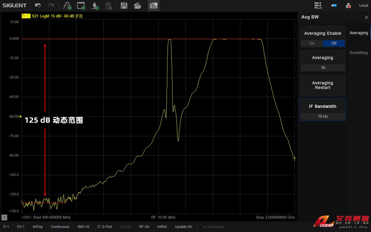 系統動態范圍是VNA一個非常重要的指標,它是VNA源的最大輸出功率與測試端口本底噪聲的差值。鼎陽SIGLENT SNA5084X矢量網絡分析儀的動態范圍可達125dB@10Hz IFBW,接收機噪底-125dBm/Hz,可適用于對動態范圍要求比較高的測試場景,比如同時測量濾波器的通帶和帶外抑制性能。