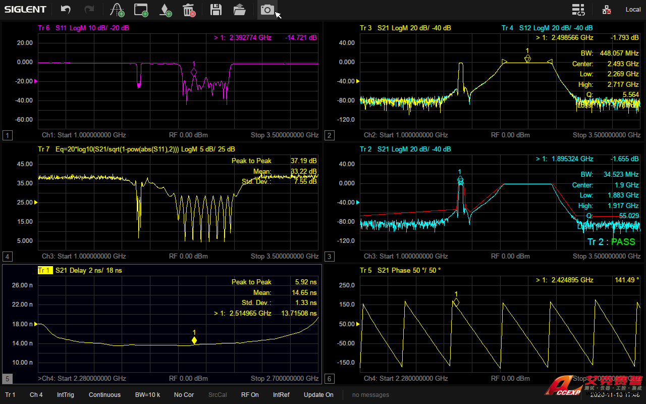 鼎陽SIGLENT SNA5084X矢量網絡分析儀支持在多個窗口添加多條跡線進行全4端口S參數測試,并且具備多種顯示格式,比如 Log Mag,Lin Mag,Phase,Delay,Smith,SWR,Polar等,可以方便快捷地分析被測物的傳輸系數,反射系數,駐波比,阻抗匹配,相位,延時等參數。在生產線驗證天線,濾波器等的特性時,還可以保存參考跡線或者添加Limit模板進行通過失敗測試,有利于提高生產效率。