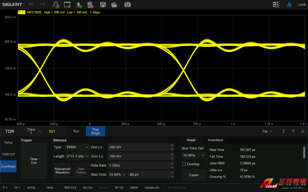 鼎陽SIGLENT SNA5084X矢量網絡分析儀搭載了眼圖功能,眼圖可以反映信號鏈路上傳輸的數字信號的整體特征,從中觀察出碼間串擾和噪聲的影響,進而估計系統的優劣程度。眼圖分析是高速系統信號完整性分析的核心,為需要對高速信號進行時域分析的客戶節省了大量成本和時間。