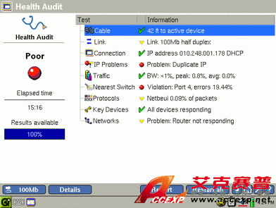 健康審核測試對 LAN 的健康狀況提供了直觀診斷,僅需點擊一下鼠標即可完成測試。本測試非常易于操作,測試結果容易理解,您只需掃上兩眼就可以找到造成復雜問題的根本原因。