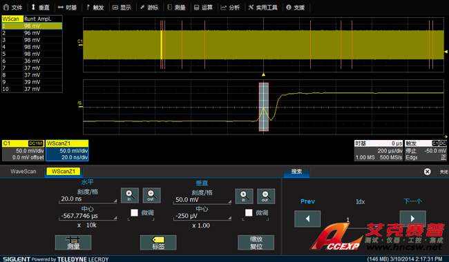 WaveScan被稱為示波器中的Google, 能夠?qū)崟r(shí)地對(duì)采集到的波形進(jìn)行測量分析,搜索出感興趣的信號(hào),可對(duì)搜索到的信號(hào)進(jìn)行列表顯示、高亮標(biāo)識(shí)和放大觀察,可以靜態(tài)地“查找”,也可以動(dòng)態(tài)地“掃描”。
