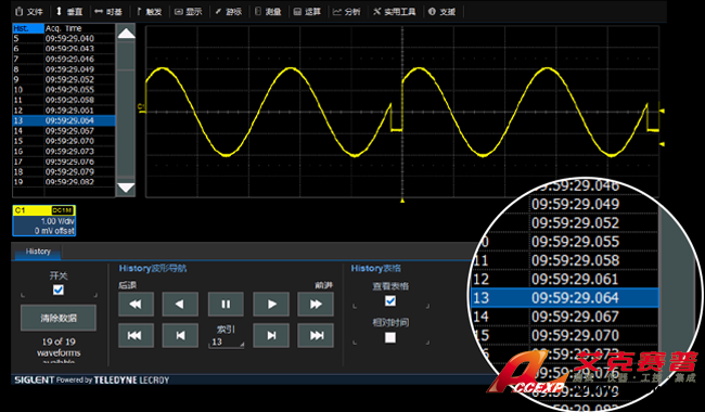 鼎陽SIGLENT SDS3054X智能示波器觸發(fā)包括窗口、間隔、漏失、欠幅、斜率、邊沿、脈寬、判定合格、邏輯圖、高清視頻和串行總線觸發(fā)(I2C、I2S、SPI、UART/RS232、LIN、CAN、CAN-FD、FlexRay、MIL1553、USB 2.0)。并且還標(biāo)配了順序和歷史模式。順序模式下,兩幀之間的最小死區(qū)時(shí)間為1 us, 其等效刷新率可達(dá)100萬幀/秒。 配合后臺(tái)運(yùn)行的歷史模式是故障分析的有力工具。