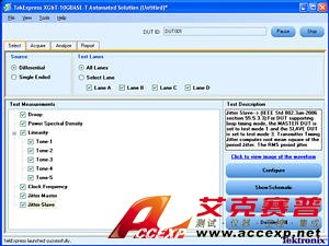 TekExpress SATA自動一致性測試軟件-完整地為發送端和接收端提供支持SATA Gen1 和SATA Gen2 定義的測試集。使用TekExpress 軟件簡單高效地 自動執行所有測試項,可節約您大約70% 的一致性測試時間。同 時,該軟件包含了自動識別測試設備,準確的DUT/Host 控制和一 鍵化測試功能。