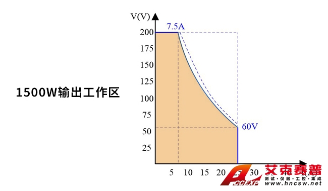 在限定輸出功率條件下,電壓電流量程自動切換,能在一臺電源上實現多種電壓和電流的組合輸出。如右圖所示,兩臺傳統的矩形輸出電源才能實現和電壓電流輸出組合,而一臺即可滿足,并且還可多實現弧線區域的參數輸出。對比傳統的矩形輸出范圍,電源提供了更寬的電壓電流輸出范圍,極大的提高了電源的利用率。