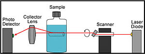 采用"近前向光散射"原理,旋轉激光束通過流通池的玻璃器壁,當光束通過中心"感測區"時,PC-2200同時測出懸浮顆粒的的數量和粒徑大小.光脈沖產生的模擬信號輸入計算機并進行數字化.