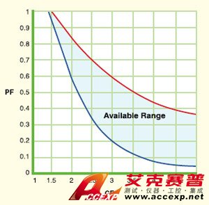 PF值的范圍會因設定的CF值而有所限制(如圖1所示)。此外,在63800系列的定義里,若設定的PF為正時,則表示電流超前電壓 ; 反之,當PF設定為負時,則表示電流落后電壓。(見下圖)
