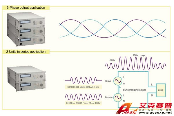 Model 61501/61502/61503/61504/61505可以使用三臺(tái), 在三相模式的同步機(jī)制下, 串聯(lián)成三相電輸出使用. 或使用兩臺(tái)做高壓(300V-600V)輸出應(yīng)用, 搭配LIST模式可進(jìn)行瞬間高壓450V/0.5秒的測(cè)試, 如圖.